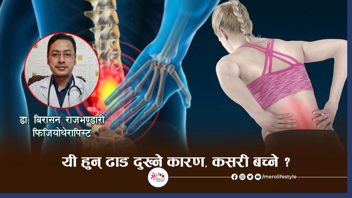 धेरैलाई ढाड दुख्ने समस्याले सताउने गर्छ । अझै पुरुषको तुलनामा यो समस्या महिलामा धेरै हुन्छ । अस्तव्यस्त जीवनशैली, लामो समयसम्म कम्प्युटरमा बसेर काम गर्ने, गलत तरिकाले एकै ठाउँमा बस्ने तथा व्यायाम नगर्ने बानीका कारण पनि आजभोल यो समस्या बढ्दै गइरहेको छ । योसँगै ढाड दुख्ने कारणहरु के के हुन् ? र, यो समस्याबाट कसरी बच्ने भन्ने विषयमा फिजियोथेरापिस्ट डा. बिरासन राजभण्डारीको सुझाव यस्तो छ :