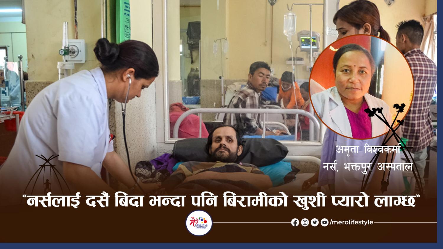 अमृता विश्वकर्मा भक्तपुर अस्पतालकी नर्स हुन् । १६ वर्ष लामो सेवा अवधिमा उनले ३, ४ वटा दसैंमा मात्र बिदा बसेकी छन् । उनलाई दसैंमा बिदा बस्न, परिवारसँग रमाउन मन नभएको कहाँ हो र ? उनले अँगालेको पेसा नै त्यस्तै छ । जहाँ चाडपर्व, रितीरिवाजभन्दा माथि बिरामी हुन्छन् । उनीहरुको सेवामा रातदिन खटिँदा कतिपय महत्वपूर्ण चाडपर्व तिनै बिरामीको सामिप्यमा बिताउन बाध्य हुन्छन् । तैपनि अमृताको कुनै गुनासो छैन । ‘हाम्रो पेसा नै यस्तो हो,’ उनी भन्छिन्, ‘सुरुसुरुमा दसैंमा बिदा नमिल्दा दुःख लाग्थ्यो । तर, अहिले बानी परिसक्यो । दसैंको रमाइलो भन्दा बिरामीको खुशी भएको देख्दा गर्व लाग्छ ।’