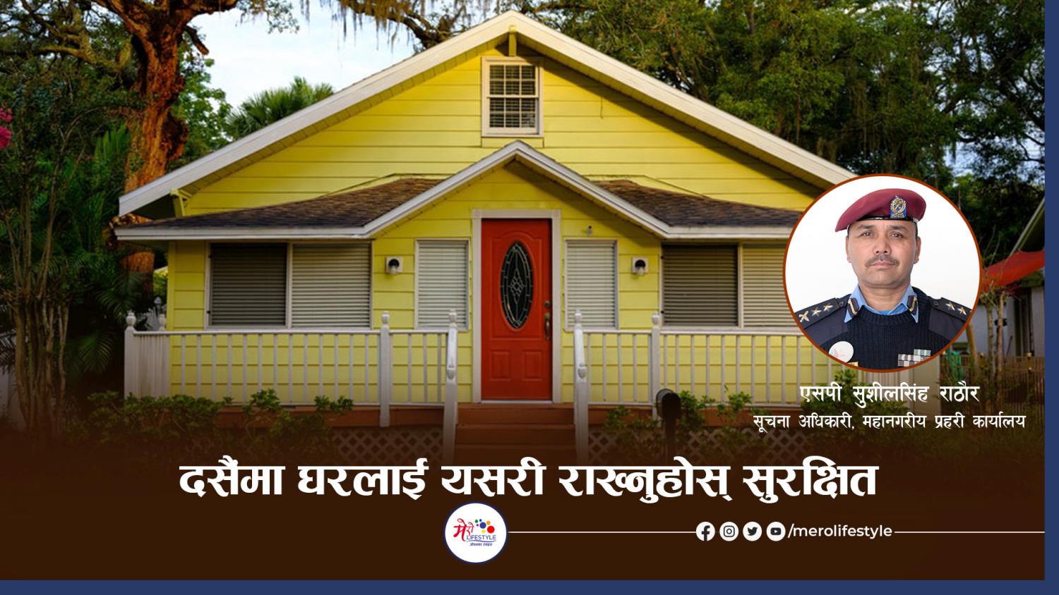 चाडबाडमा घर र डेरा छोडेर दसैं मनाउन सहरबाट अधिकांश गाउँ फर्किन्छन् । त्यसैले यतिबेला चोरीका घटना धेरै बढ्छन् । घर छोडेर जाँदा घरलाई सुरक्षित र चोरी हुन नदिनका लागि विशेष सावधानी अपनाउन जरुरी छ । त्यसैले घरलाई सुरक्षित राख्न के कुरामा ध्यान दिनुपर्ने बारे महानगरीय प्रहरी कार्यालयका सूचना अधिकारी एसपी सुशीलसिंह राठौरको सुझाव यस्तो छ ः
