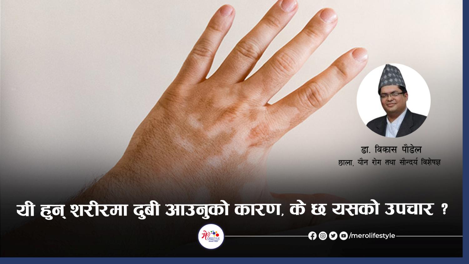छालाको बाहिरी भागमा सेतोे दाग देखिने र फैलिने समस्यालाई अंगे्रजीमा ‘भिटिलिगो’ भनिन्छ र नेपालीमा दुबी भनिन्छ । सेतो दुबी, जुन शरीरमा रङ उत्पादन गर्ने ‘मेलानोसाइट’ नष्ट भएर हुन्छ ।दुबीले शारीरिक रूपमा कुनै असर पार्दैन । तर, यसले मानसिक रूपमा हिनता बोधको सिकार बनाउँछ । सेतो दुबीले ओठ तथा औंलाहरू पूरै सेतो बनाउँछ । ‘मेलानोसाइट’ कोषले शरीरमा रङ उत्पादन गर्ने काम गर्छ । यो कुनै कारणले नष्ट भयो भने शरीरमा रङ हराउँदै जान्छ ।