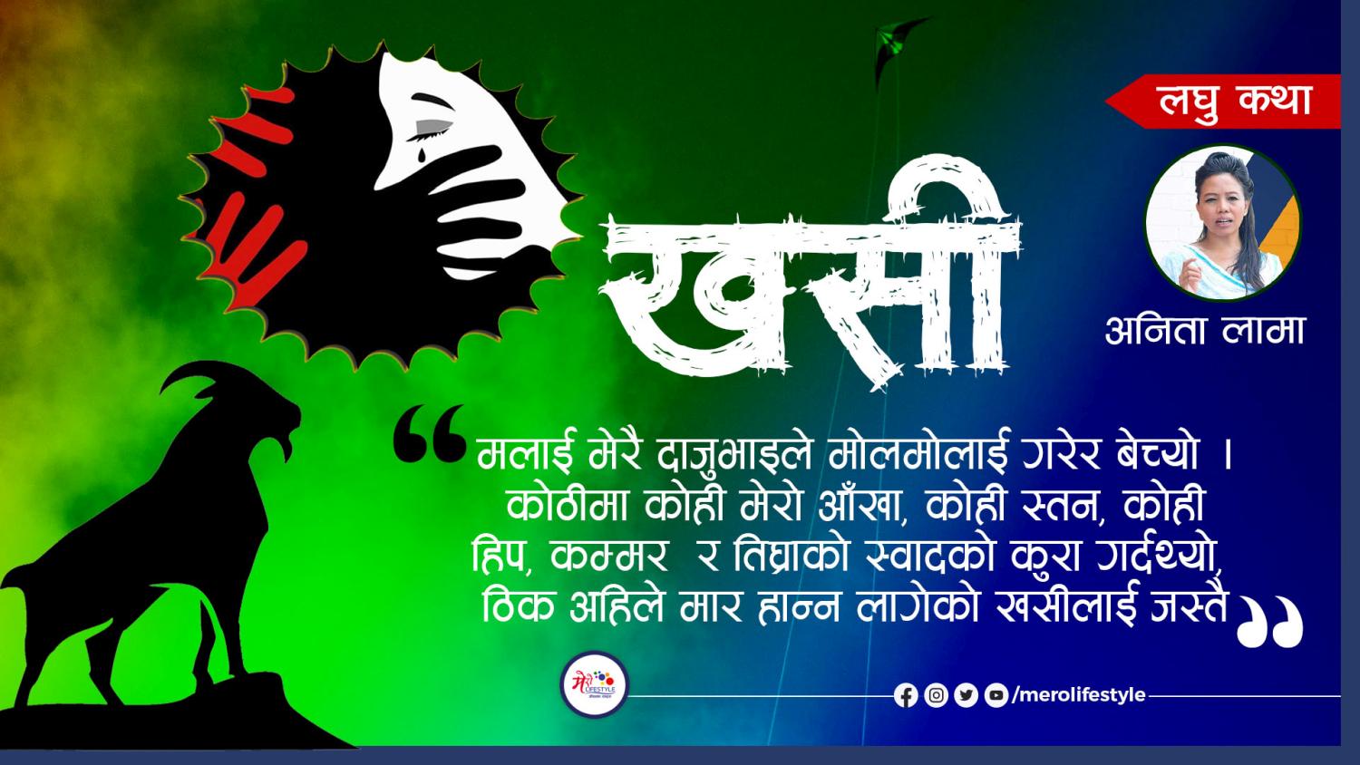 मलाई मेरै दाजुभाइले मोलमोलाई गरेर बेच्यो । कोठीमा कोही मेरो आँखा, कोही स्तन, कोही हिप, कम्मर र तिघ्राको स्वादको कुरा गर्दथ्यो, ठिक अहिले मार हान्न लागेको खसीलाई जस्तै, मलाई त्यो बधशालाबाट भगाएर मेरो लोग्नेले केही महिना अघि यहाँ ल्याउनुभयो । मैले पनि खसीलाई म जस्तो हुन दिन सकिनँ र भगाएँ ।