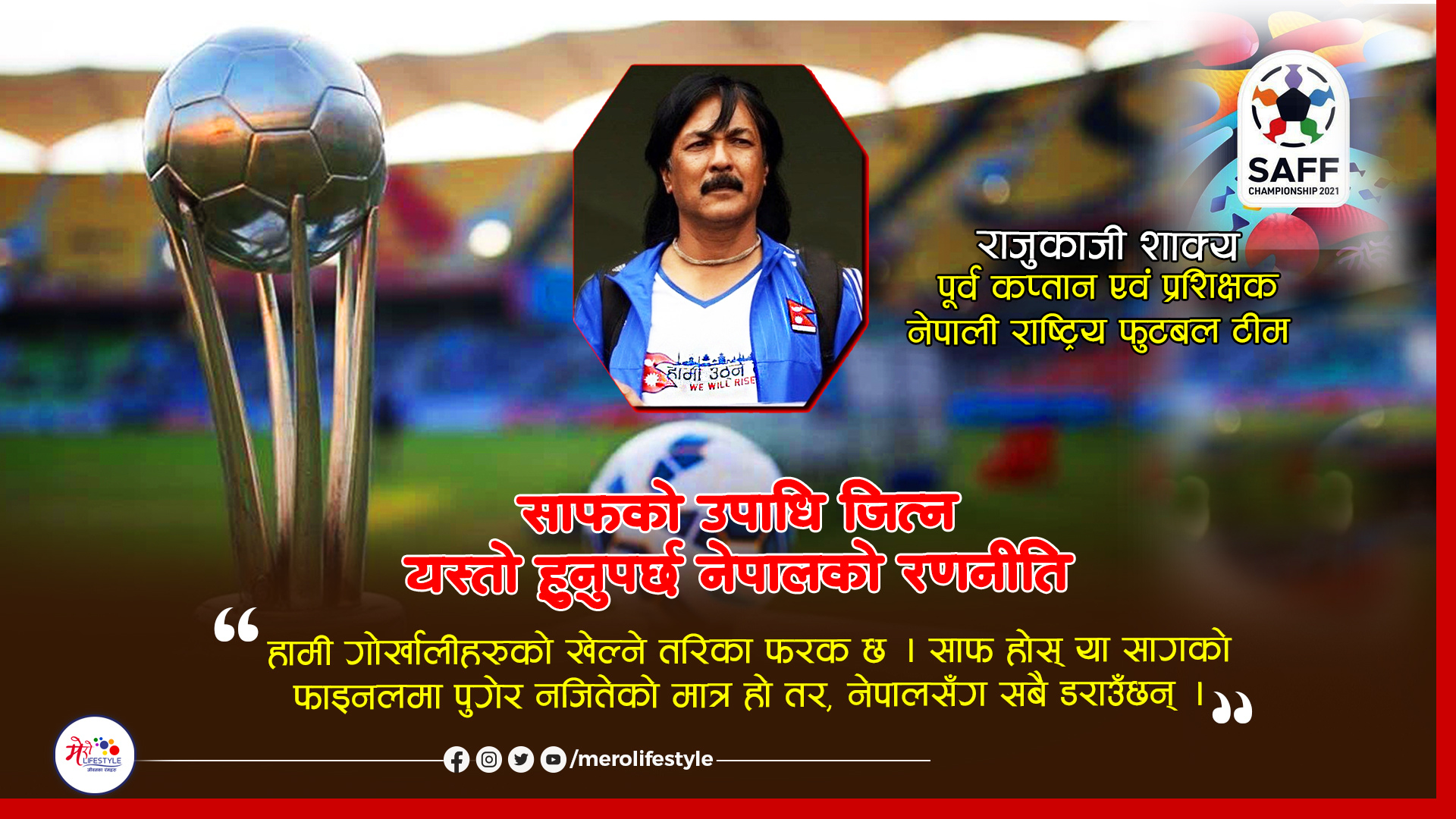 नेपाल साफ च्याम्पियनसिप फुटबलको इतिहासमा पहिलोपटक फाइनल प्रवेश गरेको छ । माल्दिभ्समा जारी १३ औं संस्करणको उपाधिका लागि आज (शनिबार) नेपाल र भारत भिड्दैछन् । मालेस्थित राष्ट्रिय फुटबल रंगशालामा हुने फाइनल खेल नेपाली समयअनुसार राति ८ः४५ बजे सुरु हुनेछ । नेपाली फुटबल टोलीले ४ खेलमा गरेका गल्ती, सुधारसहितको समिक्षा र फाइनलमा अपनाउनु पर्ने रणनीति बारे राष्ट्रिय टिमका प्रशिक्षकसमेत रहिसकेका शाक्य यसो भन्छन् । शाक्यले खेलाडी र प्रशिक्षक दुवै भूमिकामा रहेर दक्षिण एसियाली खेलकुद सागमा स्वर्ण जितेका थिए । सन् १९९३ मा नेपालले साग जित्दा शाक्य टोलीको कप्तान र २०१६ मा भएको १२ औं सागमा उनकै प्रशिक्षणमा नेपालले स्वर्ण जितेको थियो ।