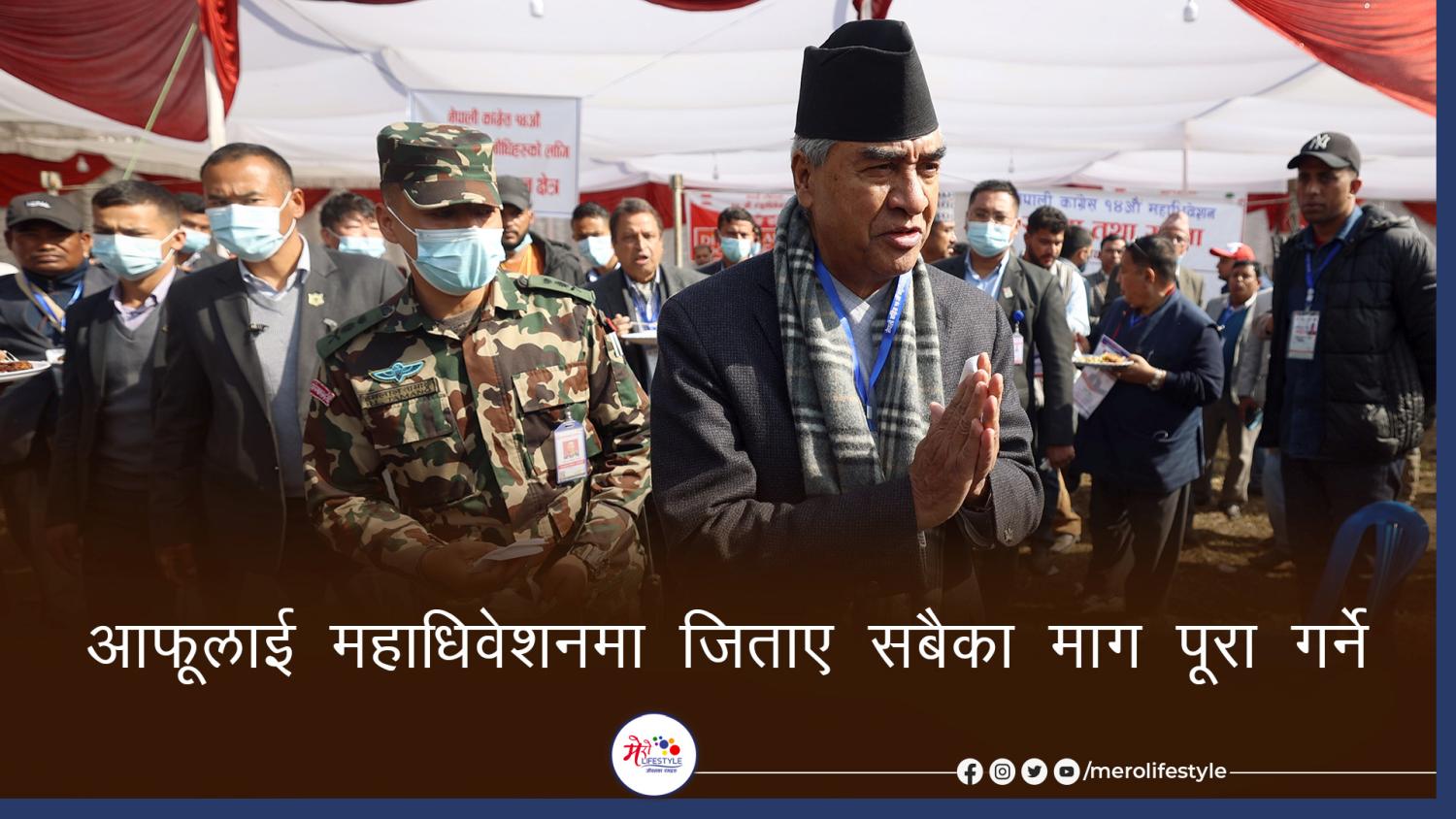 “हिजोको सरकार हुँदा कस्तो हालत थियो, तपाँइहरुलाई थाहा नै छ र अहिले कति हलुका भएको छ, त्यसैले अहिलेको बेला यो कांग्रेसले जित्न जरुरी छ, कांग्रेसले जितेको खण्डमा मात्रै देशलाई अघि बढाउन सकिन्छ, त्यसका लागि यो महाधिवेशन महत्वपूर्ण छ”, उनले भने, “सभापतिमा मैले पनि उम्मेदवारी दिएको छु, अत्यधिक बहुमतले मलाई जिताउनुभयो भने अवस्य नै म सम्पूर्ण मागहरु पूरा गर्नेछु ।”