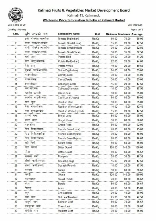 आज माघ २० गते फलफूल तथा तरकारीको मूल्य [सूची]