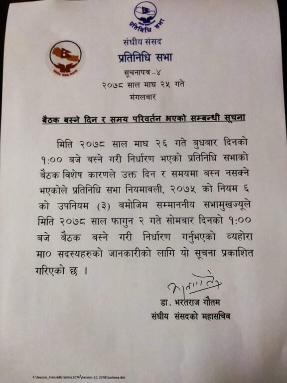 सूचनामा भनिएको छ,‘प्रतिनिधिसभा नियमावली, २०७५ को नियम ६ को उपनियम (३) बमोजिम सम्माननीय सभामुखज्यूले मिति २०७८ साल फागुन २ गते सोमबार दिनको १:०० बजे बैठक बस्ने गरी निर्धारण गर्नुभएको व्यहोरा मा. सदस्यहरुको जानकारीको लागि यो सूचना प्रकाशित गरिएको छ ।’