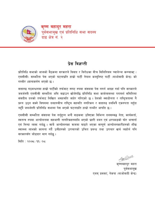 सरकारले एमसीसी जबर्जस्ती अगाडि बढायो : माओवादी केन्द्र