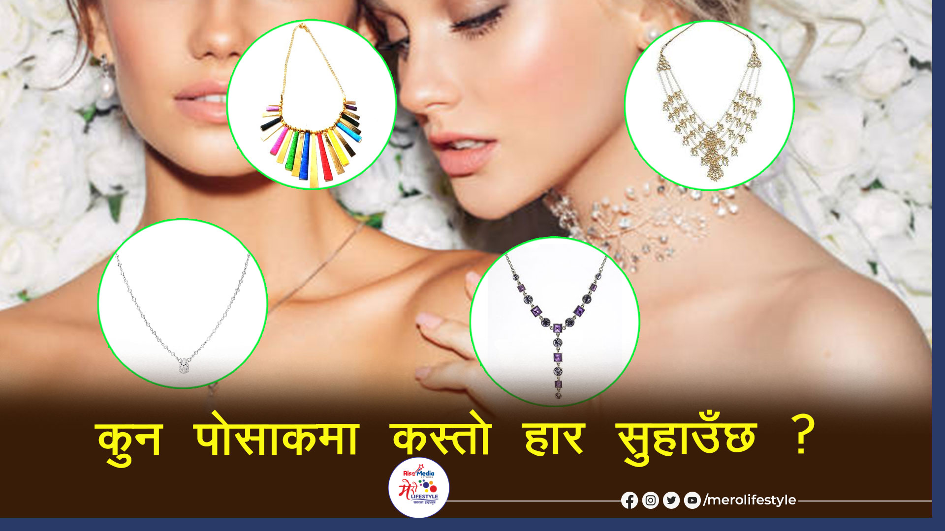 अधिकांश महिलाहरू आफ्नो पहिरनसँगै गहना लगाउन चाहन्छन् । यस्तो अवस्थामा परम्परागत होस् वा पश्चिमी शैलीको पोसाक, महिलाहरूले पक्कै पनि आफ्नो आउटफिटका साथमा नेकलेस लगाउने गर्छन् । तर, पश्चिमी पहिरनमा कस्तो गहना लगाउने भन्नेमा महिलाहरू निकै अन्योलमा छन् । तसर्थ, सबै पोसाकहरूमा सुहाउने केही नेकलेसबारे जानकारी दिँदै छौँ ।