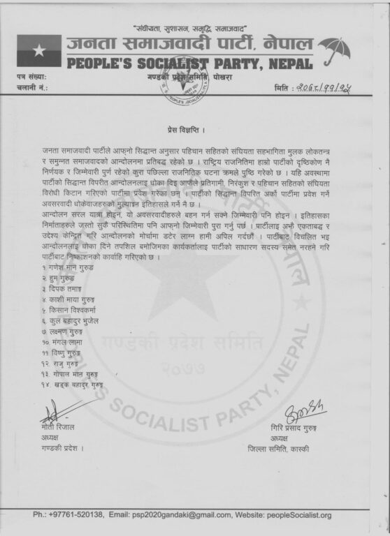 जनता समाजवादी पार्टी, नेपाल (जसपा) ले १४ जना नेता तथा कार्यकर्तालाई साधारण सदस्यसमेत नरहने गरी पार्टीबाट निष्कासित गरेको छ । पार्टीको गण्डकी प्रदेश कमिटीले उनीहरूलाई निष्कासन गरेको हो ।