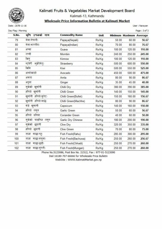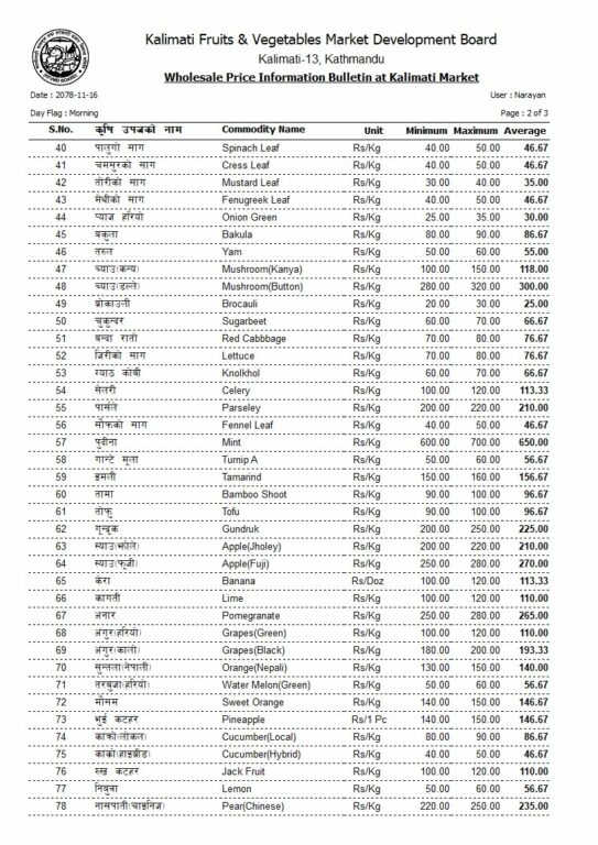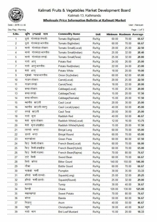 आजको फलफूल तथा तरकारीको मूल्यसूची