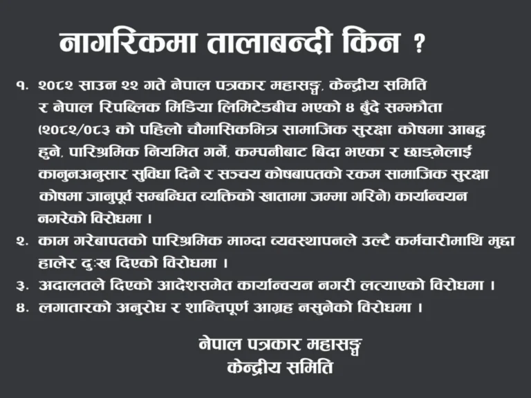 सन्जिब दुलालकाठमाडौँ । श्रमजीवी पत्रकारका न्यायोचित मागहरू पटक–पटक उठाउँदा पनि व्यवस्थापन पक्षबाट सुनुवाइ नभएपछि नेपाल पत्रकार महासंघले आज बुधवार बिहान