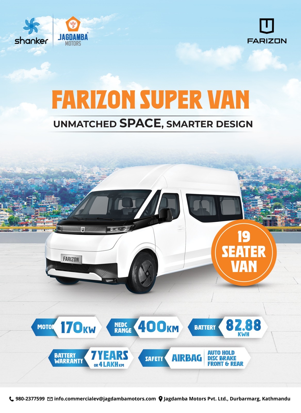 काठमाडौं : नेपालको अग्रणी अटोमोबाइल कम्पनी जगदम्बा मोटर्स प्रा.लि., शंकर समूह अन्तर्गतको एक प्रतिष्ठित कम्पनीले अब व्यावसायिक विद्युतीय सवारी साधन (इभी) को क्षेत्रमा पनि आफ्नो उपस्थिति विस्तार गर्दैछ। कम्पनीले Farizon, Chery Wanda र King Long जस्ता चिनियाँ ब्रान्डहरू मार्फत १४ देखि १९ सिटर क्षमताका बहुउपयोगी व्यावसायिक इभीहरु नेपाली बजारमा ल्याएको छ।