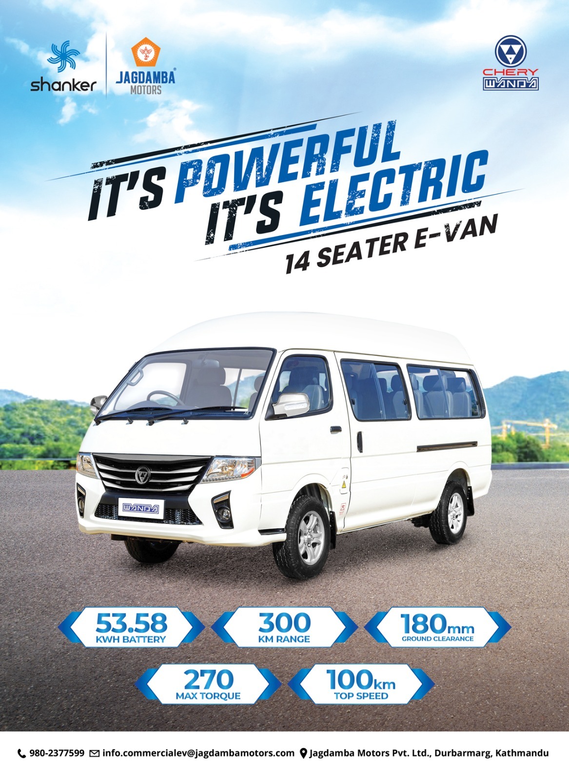 नेपालले निजी सवारी साधनमा इभीको अभूतपूर्व वृद्धि देखाएपछि अब व्यावसायिक इभी क्षेत्रमा पनि उल्लेखनीय वृद्धि भइरहेको छ। यही प्रवृत्तिलाई मध्यनजर गर्दै जगदम्बा मोटर्सले सार्वजनिक यातायात, कर्मचारी ढुवानी, तथा पर्यटनजस्ता प्रयोजनका लागि उपयुक्त इभी भ्यानहरु प्रस्तुत गरेको हो।