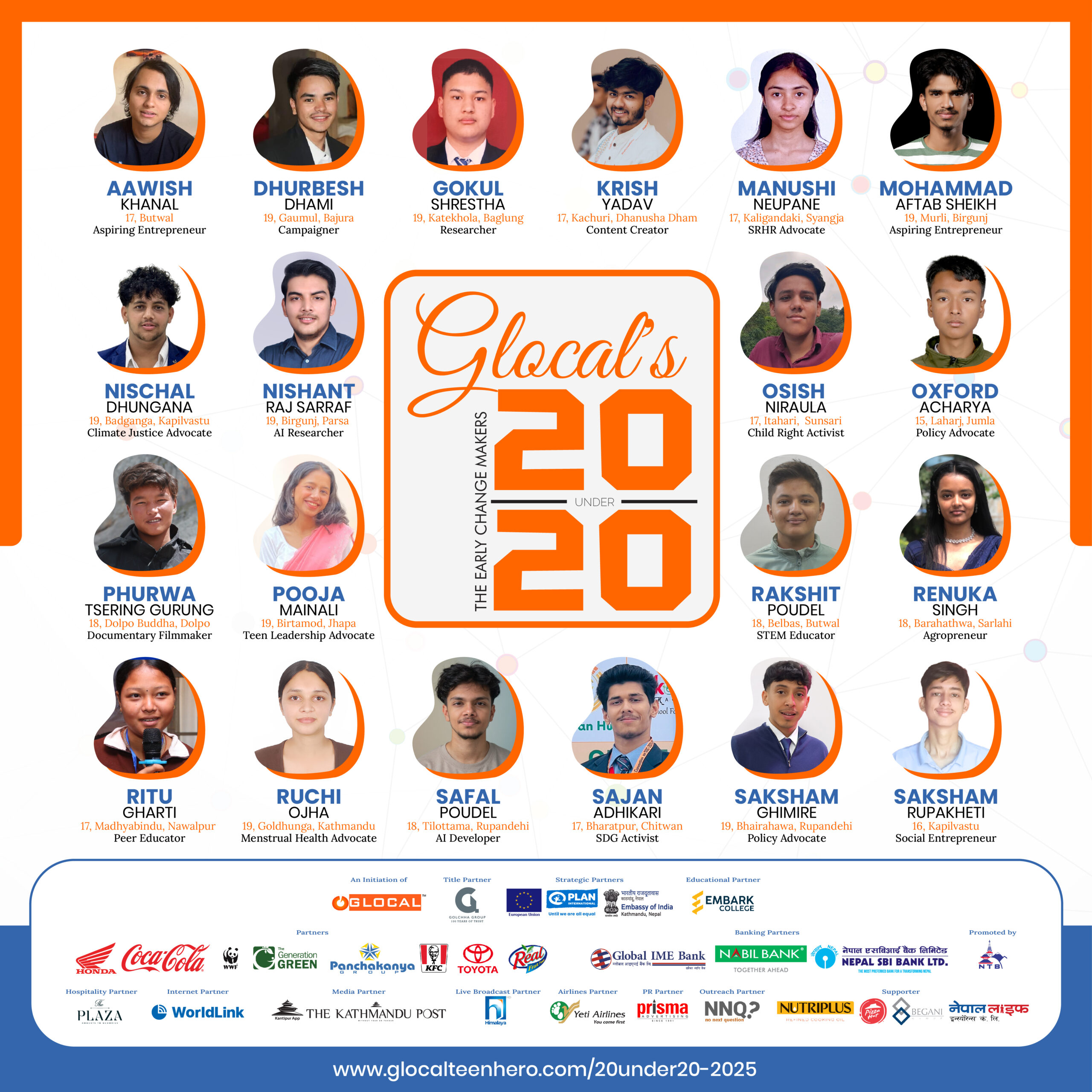 काठमाडौं, नेपाल: प्रतिष्ठित ग्लोकल टीन हिरो २०२५ का आयोजक ग्लोकल प्रा.लि. ले यस वर्षका ग्लोकल २० अन्डर २० भनी पहिचान गरिएको आधिकारिक सूची सामाजिक सन्जाल मार्फत सार्वजनिक गरेको छ। यस वर्षको छनोट नेपालभरका युवाहरूको असाधारण प्रतिभा, दूरदृष्टि र नेतृत्व क्षमता प्रदर्शन गर्ने उत्कृष्ट आवेदकहरूमध्येबाट गरिएको हो।