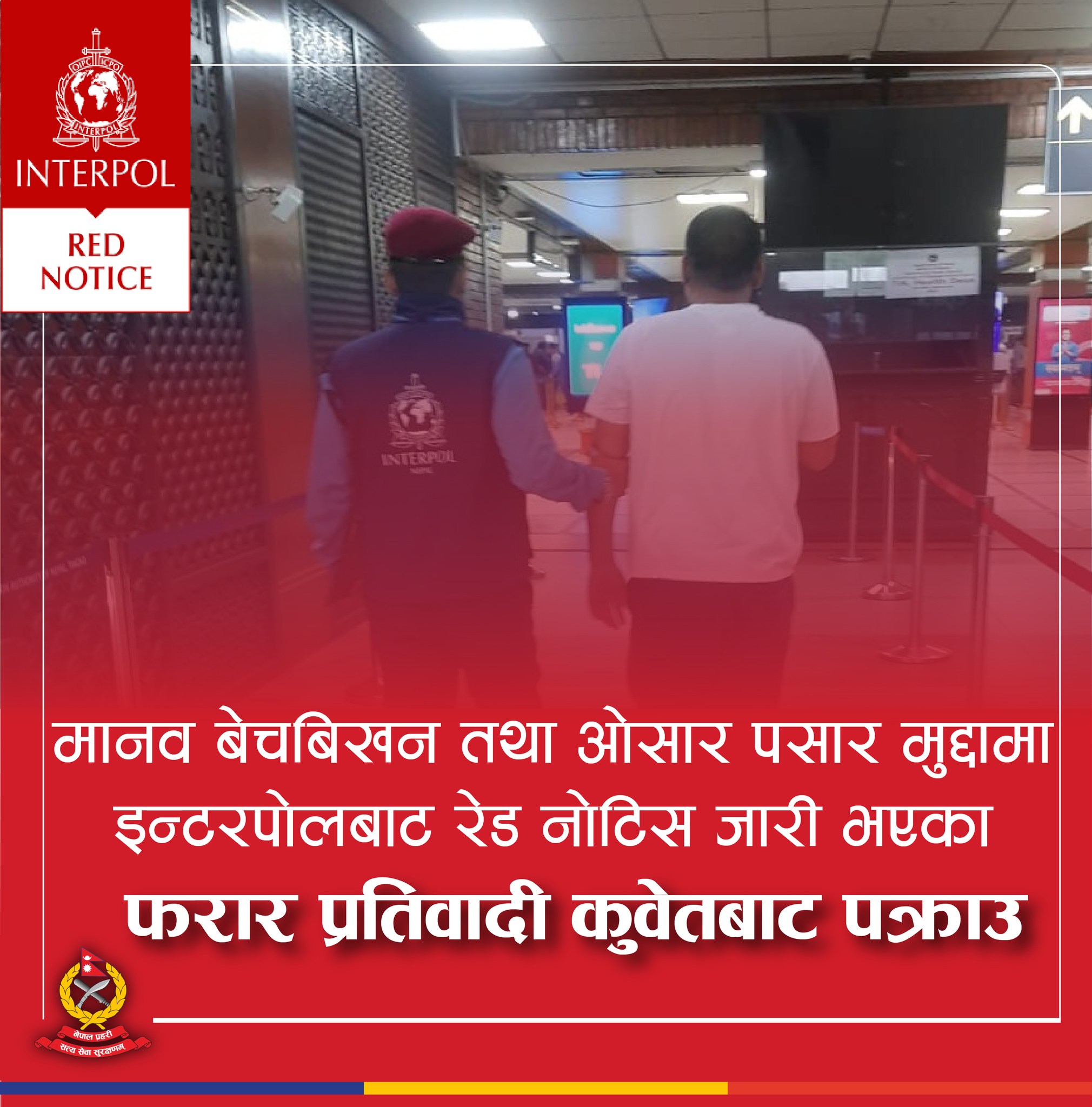 उनलाई सम्बन्धित कसूर बमोजिम कानूनी कारवाहीको लागि जिल्ला प्रहरी कार्यालय सुर्खेत बुझाइने नेपाल प्रहरी प्रधान कार्यालय इन्टरपोल शाखाले जनाएको छ ।