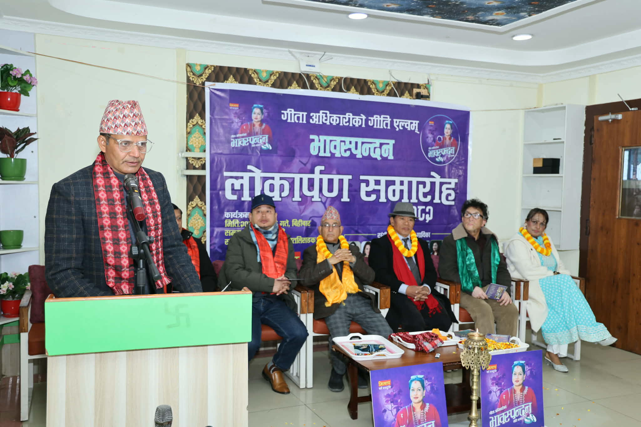 काठमाडौं । पत्रकार/गीतकार गीता अधिकारीले आफ्नो जन्मदिनमा गीति एल्बम ‘भावस्पनदन’ श्रोता/दर्शकमाझ ल्याउनुभएको छ । मिलापको आयोजनामा बिहीबार काठमाडौंमा एक विशेष समारोहबीच महाकाव्यकार खेमनाथ दाहालको सभापतित्वमा उक्त गीति एल्बमको लोकार्पण गरिएको हो । गीतकार÷साहित्यकार अमर वान्तुको प्रमुख आतिथ्यतामा गीतकार संघका वसन्त वित्यासी थापा, अन्तर्राष्ट्रिय नेपाली साहित्य अध्यक्ष राधेश्याम लेकाली, वरिष्ठ कलाकार तथा गीतकार उत्तम केसी, वरिष्ठ संगीतकार राजु सिंह, स्रष्टा गीता अधिकारी, एल्बमसँग सम्बन्धित संगीतकार दीपक शर्मा, संगीतकार राजेन्द्र बजगाईं र गायक सविन सुवेदीलगायतले उक्त गीति एल्बमको लोकार्पण गर्नुभएको थियो ।