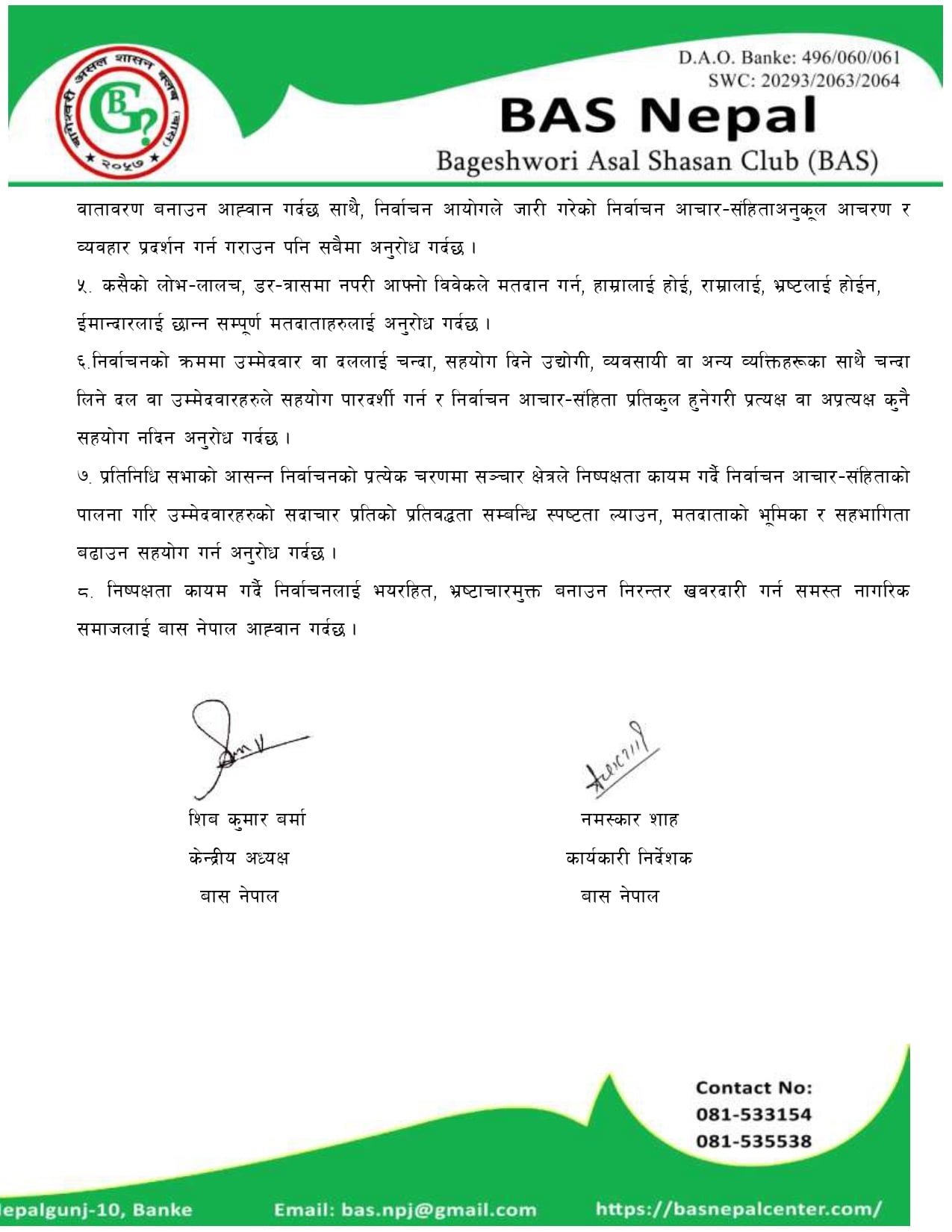 ८. निष्पक्षता कायम गर्दै निर्वाचनलाई भयरहित, भ्रष्टाचारमुक्त बनाउन निरन्तर खवरदारी गर्न समस्त नागरिक समाजलाई बास नेपाल आह्वान गर्दछ । शिब कुमार बर्मा नमस्कार शाह केन्द्रीय अध्यक्ष कार्यकारी निर्देशक बास नेपाल बास नेपाल